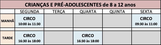 M A N H ÃSegunda | 10:00 às 11:30Sexta | 09:30 às 11:00T A R D ESegunda | 16:30 às 18:00Quarta | 16:30 às 18:00