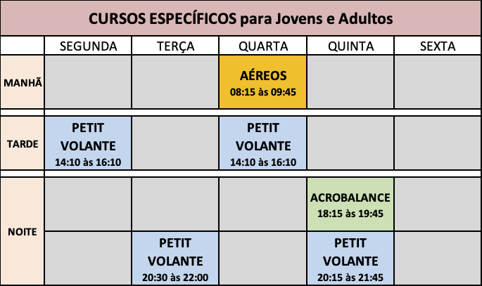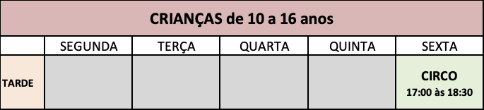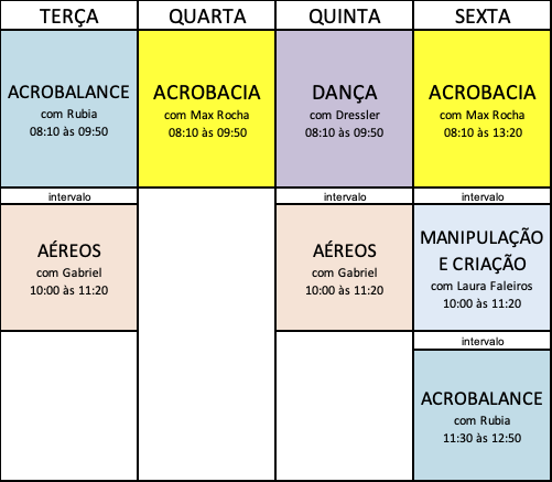 T A R D ESegunda | 11:45 às 14:00 – Espaço da Cama-elásticaTerça | 11:45 às 14:00 – Espaço da Cama-elásticaQuarta | 11:45 às 14:00 – Espaço da Cama-elásticaQuinta | 11:45 às 16:00 – Espaço da Cama-elásticaSexta | 14:30 às 16:30 – Espaço da Cama-elásticaSexta | 14:30 às 16:30 – Espaço dos AéreosN O I T ETerça | 20:40 às 21:50 – Espaço da Cama-elásticaQuinta | 19:50 às 21:50 – Espaço da Cama-elásticaQuinta | 19:50 às 21:50 – Espaço dos Aéreos