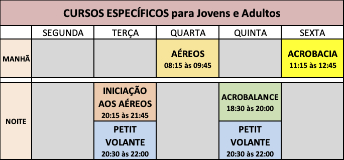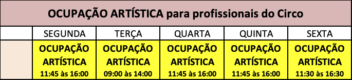 M A N H Ã e T A R D ESegunda | 11:40 às 13:20 – Espaço dos AéreosSegunda | 13:30 às 16:00 – Espaço da Cama-elásticaTerça | 09:00 às 14:00 – Espaço da Cama-elásticaQuarta | 11:40 às 13:20 – Espaço dos AéreosQuarta | 13:30 às 16:00 – Espaço da Cama-elásticaQuinta | 11:40 às 16:00 – Espaço da Cama-elásticaSexta | 11:40 às 16:30 – Espaço da Cama-elásticaSexta | 11:40 às 16:30 – Espaço dos Aéreos
